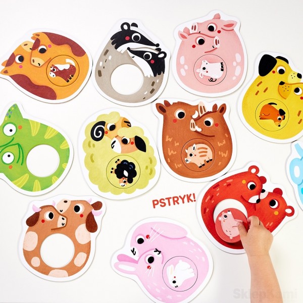 Nazywajcie zwierzątka, ich kolory, części ciała. Opowiadajcie o tym, co widać na obrazkach, powtarzając nowe słownictwo. Wymyślajcie historyjki o bohaterach układanek.
