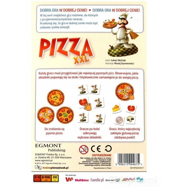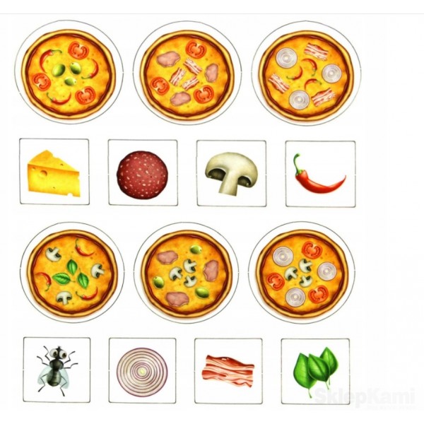 Pyszna rozgrywka! Gra imprezowa, o zwycięstwie decydują re fleks i spostrzegawczość. Zadaniem graczy jest przygotowanie jak największej liczby pysznych pizz. Należy obserwować, jakie składniki pojawiają się na stole, i błyskawicznie zamawiać je do swojej pizzy. Gracz, który najszybciej zaklepie gotową pizzę, zdobywa punkt.