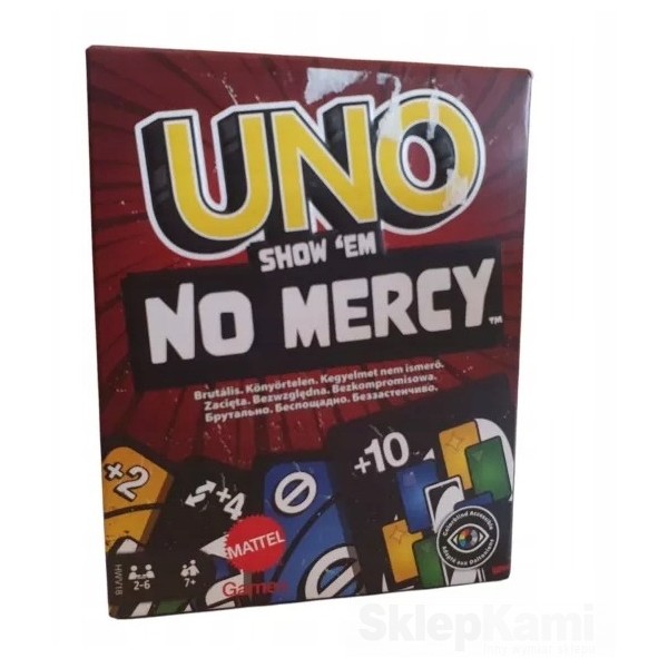UNO No Mercy Bez litości to najbardziej bezwzględna wersja UNO! Ma o wiele więcej kart i DUŻO surowsze kary (dobieranie 10 kart to wyzwanie!), a do tego nowe reguły, przez które gracze będą dokładać, wymieniać i dobierać więcej kart niż kiedykolwiek wcześniej. Jest tu nawet reguła Litości (ironiczne, co?), jeśli sprawy zabrną za daleko. Tę najsurowszą wersję klasycznej gry można wygrać na dwa sposoby: pozbyć się wszystkich kart ALBO wyeliminować pozostałych graczy... z rozgrywki oczywiście. Nie zapomnij zawołać UNO!, gdy w ręce zostanie Ci tylko jedna karta!