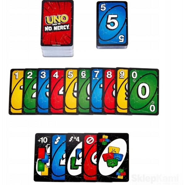 UNO No Mercy Bez litości ma 56 dodatkowych kart, reguły specjalne i bardzo surowe karty specjalne, które razem tworzą najbardziej zaciekłą rozgrywkę UNO w dziejach.
