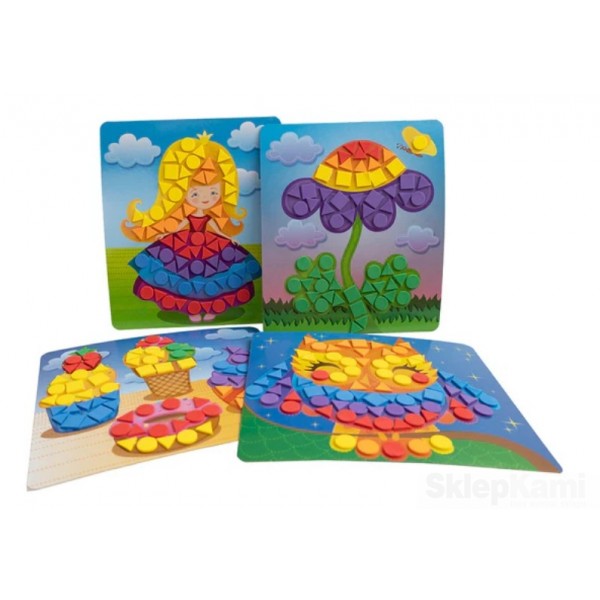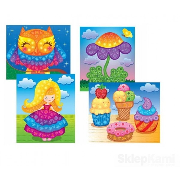 W zestawie są 4 obrazki, na które w odpowiednie miejsca należy nakleić piankowe elementy w kształcie kółka, kwadratu czy trójkąta, aby stworzyć piękne dzieło.