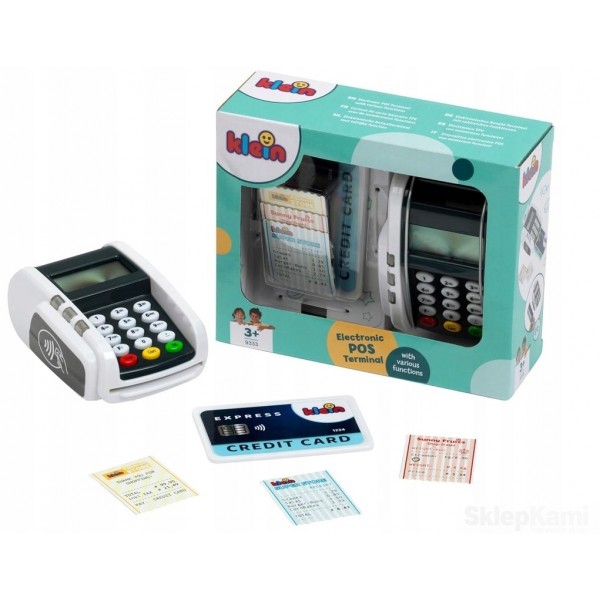 Terminal płatniczy stworzona przez firmę Klein, jest w kolorze biało-szarym z czarnym pulpitem klawiatury. Zabawka wykonana jest z plastiku wysokiej jakości i ma wiele funkcji, które zainteresują każdego małego właściciela sklepu. Ten dodatek do zabawkowych kas wnosi powiew nowoczesnej technologii do pokoju dziecięcego. Płatności bezdotykowe stają się tutaj formą zabawy, ale i nauki rzeczywistości. Terminal płatniczy do złudzenia przypomina prawdziwe urządzenie. Posiada działające przyciski oraz czujnik płatności zbliżeniowych. Podczas użytkowania emituje delikatnie światełko oraz wydaje dźwięki. Podczas zabawy wystarczy wprowadzić i potwierdzić kwotę, przyłożyć kartę do terminala, wprowadzić i potwierdzić PIN, i płatność gotowa. Przesuwaniu dołączonej do zestawu karty kredytowej przez czytnik towarzyszą realistyczne odgłosy, jak w prawdziwym urządzeniu.
