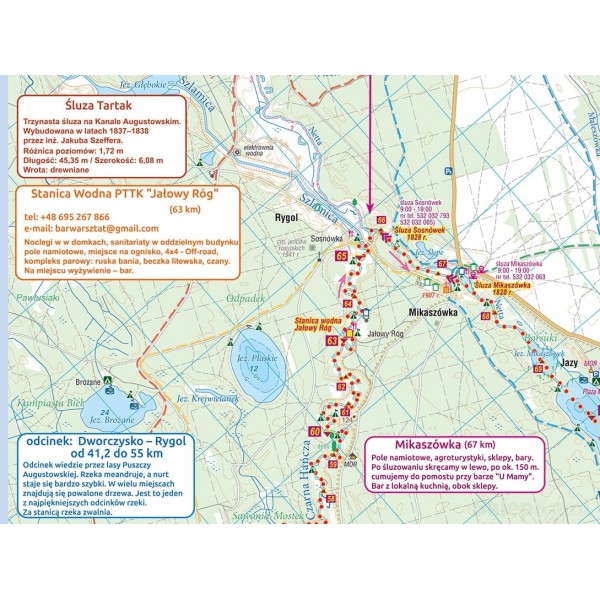 Dodatkowo na mapie znajduje się krótki opis szlaku kajakowego z podziałem na etapy. Są informacje praktyczne, istotne uwagi dotyczące utrudnień na trasie, opisy stanic, śluz i ważniejszych miejscowości. Całość uzupełniają schematy szlaku kajakowego i poradnik kajakarza.