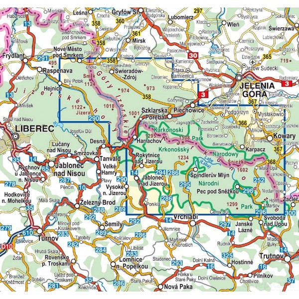 Karkonosze, Góry Izerskie – mapa turystyczna 1:35 000 to szczegółowa, dwustronna mapa obejmująca dwa najpiękniejsze pasma Sudetów: majestatyczne Karkonosze oraz malownicze Góry Izerskie. Na jednej stronie znajduje się dokładna mapa masywu Karkonoszy, na drugiej – mapa Gór Izerskich wraz z planami centrów miast: Świeradów-Zdrój, Karpacz, Szklarska Poręba, a także czeskich kurortów Harrachov i Špindlerův Mlýn.