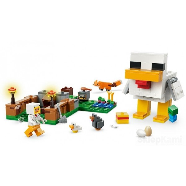 - Zestaw dla graczy — odgrywaj rolę i opiekuj się kurczakami, korzystając z ciekawych funkcji kurnika, jednocześnie odpierając ataki małego zombie, który próbuje jeździć na kurczaku w tym zestawie konstrukcyjnym LEGO Minecraft.