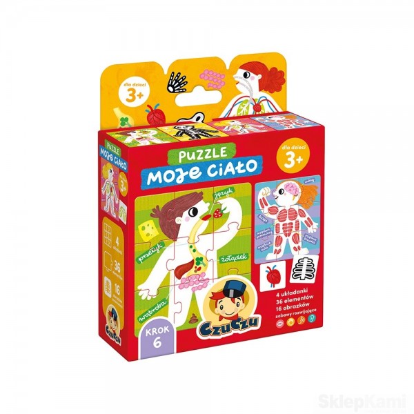 W poręcznym pudełku znajdziecie 4 kolorowe, 9-elementowe puzzle, które w przyjazny sposób przedstawiają układy ciała. To doskonały zestaw dla przedszkolaków i zaproszenie do pierwszej lekcji biologii. Do każdej układanki pasują 4 obrazki z różnymi organami, dzięki czemu puzzle można na wesoło utrwalać nowe słowa, ćwiczyć spostrzegawczość i refleks. Można też stworzyć własną w grę i trenować pamięć. Edukacyjne zabawy start!