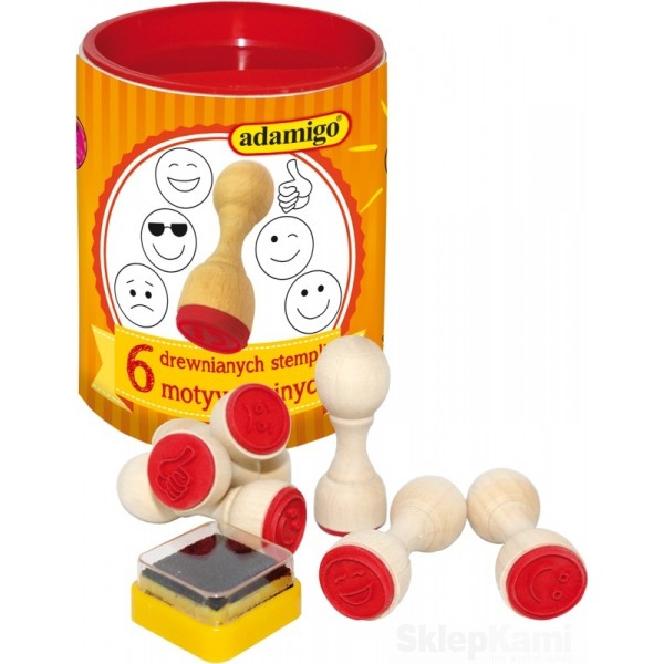 Zestaw 6 drewnianych stempelków do ozdabiania papeterii, dekorowania prezentów, tworzenia swoich kompozycji, oceniania prac, kolorowania. W pudełku, oprócz stempli znajduje się poduszka z tuszem. Kreatywna zabawa dla najmłodszych!