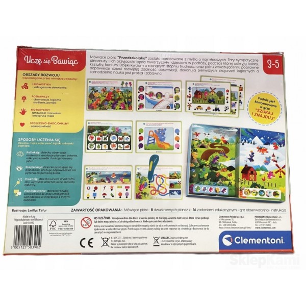 Mówiące pióro Przedszkolaka zostało opracowane z myślą o najmłodszych. Trzy sympatyczne dinozaury i ich przyjaciele będą towarzyszyły dzieciom w podróży, podczas której odkryją kolory, kształty, kontury. Dzięki kwizom o rosnącym stopniu trudności oraz pióru wskazującemu poprawne odpowiedzi dzieci rozwijają zdolność obserwacji, dokonują pierwszych skojarzeń logicznych, a samodzielna nauka jest prosta i zabawna.